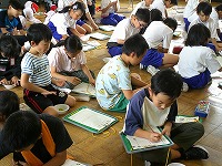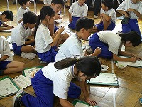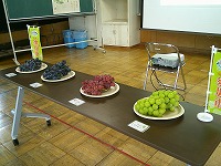 9月25日木曜日に、須坂市農林課、生産者、給食センターの方々に来ていただき、ぶどうの学習をしました。はじめに、ぶどうの育て方を勉強しました。登下校中に収穫作業を目にすることはあっても、収穫作業以外の仕事については殆ど知らない子供達。真剣なまなざしで、作業説明に耳を傾けていました。
