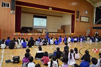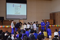 1年生が主役の「1年生を迎える会」。教室まで迎えにきてくれた6年生のお兄さんお姉さんと一緒に体育館に入場すると、2年生~5年生のお兄さんお姉さん達が、おおきな拍手で迎えてくれました。6年生が企画・進行で、各学年からの元気な挨拶があったり学校○×クイズや1年生へのインタビューなど盛りだくさんの内容でした。